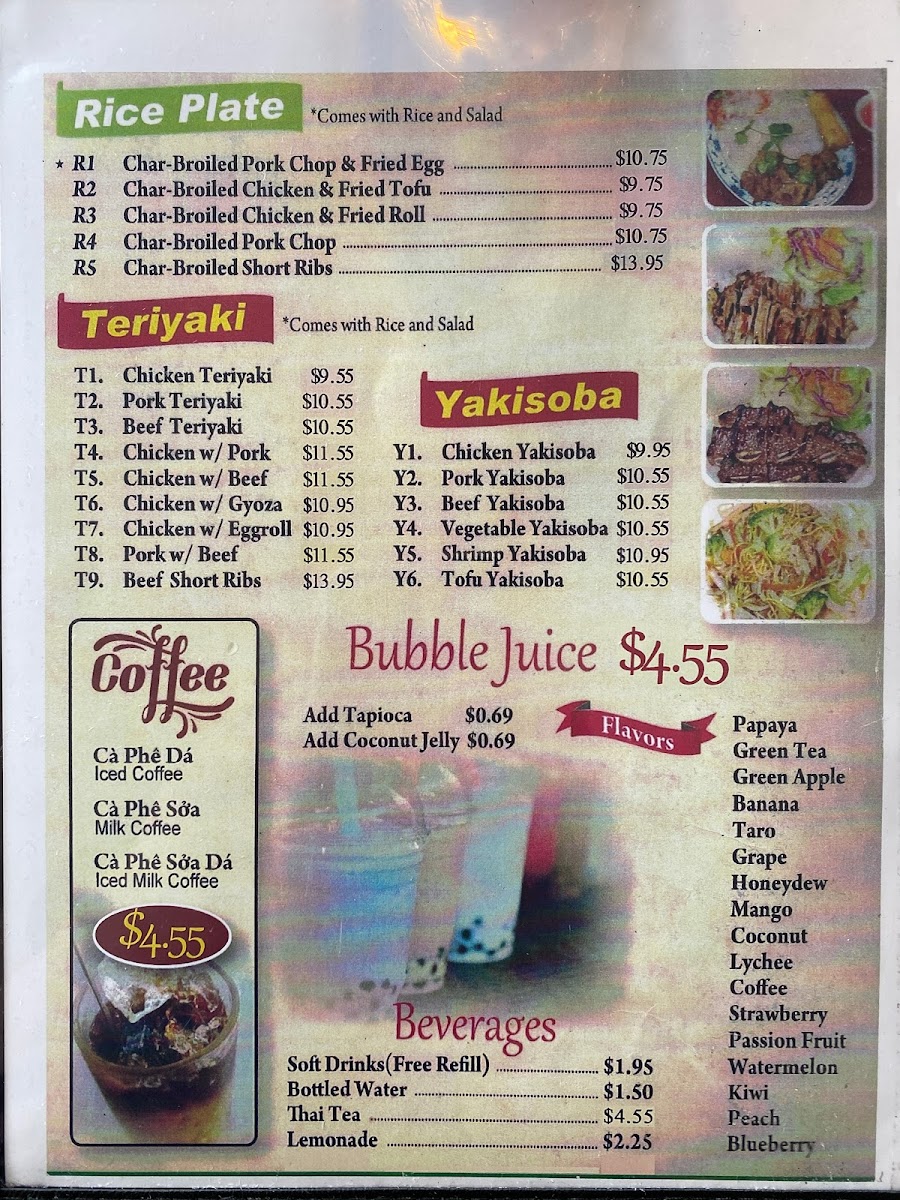 Beverages available include fruit-based smoothies and bubble juices, with flavors such as mango and passion fruit to complement the meal.